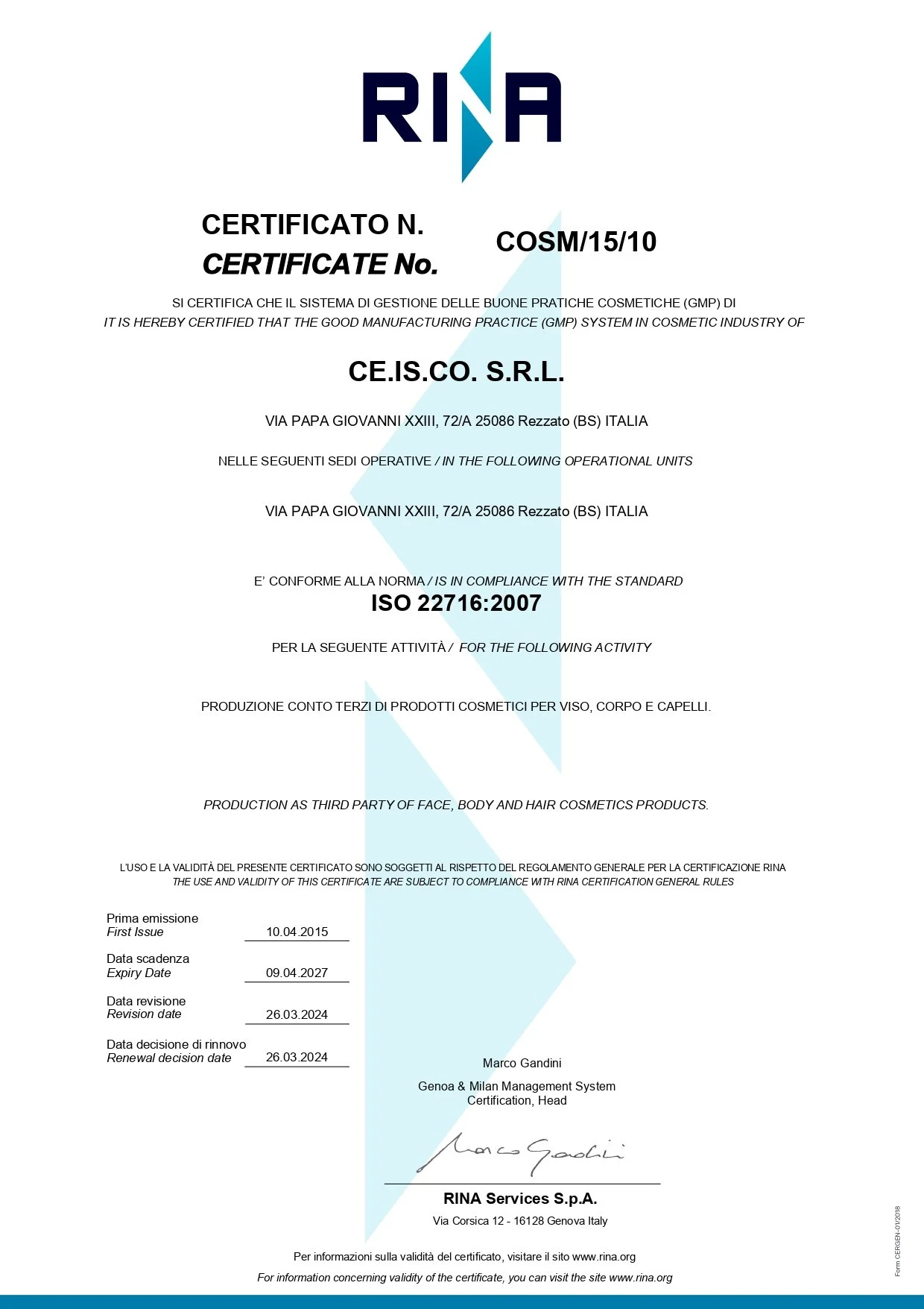 SI CERTIFICA CHE L’ORGANIZZAZIONE CE.IS.CO. S.R.L. NELLE SEGUENTI UNITÀ OPERATIVE VIA PAPA GIOVANNI XXIII, 72/A 25086 Rezzato (BS) ITALIA È CONFORME ALLA NORMA ISO 22716:2007 PER LE SEGUENTI ATTIVITA’: PRODUZIONE CONTO TERZI DI PRODOTTI COSMETICI PER VISO, CORPO E CAPELLI.